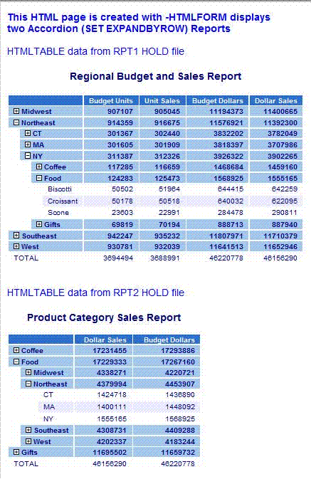 The HOLD FORMAT HTMTABLE command in conjunction with -HTMLFORM functionality supports the display of Accordion By Row (SET EXPANDBYROW, SET EXPANDBYROWTREE) reports to create an HTML page. Accordion by Column reports (SET EXPANDABLE) are not supported with -HTMLFORM.