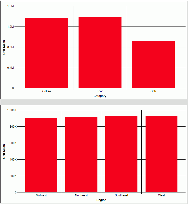 SET EMBEDDABLE=ON GRAPH FILE GGSALES SUM UNITS BY CATEGORY ON GRAPH SET LOOKGRAPH BAR ON GRAPH HOLD FORMAT JSCHART AS GRAPH1 ON GRAPH SET STYLE * type=data, column=n1, bucket=x-axis, $ type=data, column=n2, bucket=y-axis, $ END GRAPH FILE GGSALES SUM UNITS BY REGION ON GRAPH SET LOOKGRAPH BAR ON GRAPH HOLD FORMAT JSCHART AS GRAPH2 ON GRAPH SET STYLE * type=data, column=n1, bucket=x-axis, $ type=data, column=n2, bucket=y-axis, $ END -HTMLFORM BEGIN <html> <head> <title>Two HTML5 graphs in an HTMLFORM</title> !IBI.OBJ.IBIHEADJS; </head> <body> !IBI.FIL.GRAPH1; <br> !IBI.FIL.GRAPH2; </body> </html> -HTMLFORM END