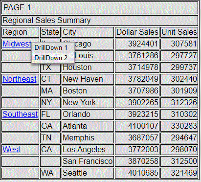 SET POPUPDESC=ON TABLE FILE GGSALES SUM DOLLARS UNITS BY REGION BY ST BY CITY HEADING "Regional Sales Summary" ON TABLE SET STYLE * TYPE=DATA, COLUMN=N1, DRILLMENUITEM='DrillDown 1', URL=http://www.ibi.com, DRILLMENUITEM='DrillDown 2', URL=http://support.ibi.com,$ ENDSTYLE ON TABLE HOLD FORMAT HTMTABLE END -HTMLFORM BEGIN <html> <BODY> <head> <title>Displaying Drilldown Menu Items Using -HTMLFORM</title> !IBI.OBJ.IBIHEADJS;</head> !IBI.FIL.HOLD; </BODY> </html> -HTMLFORM END