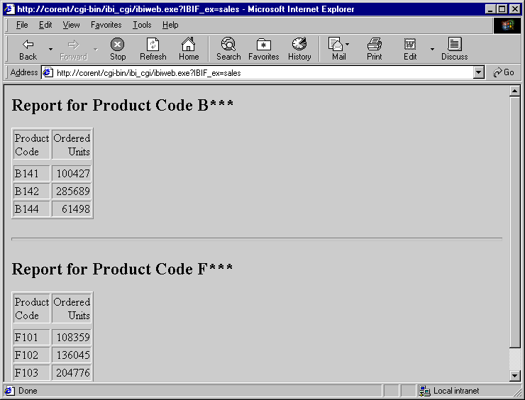 <HTML> <BODY> <A HREF="/ibi_apps/WFServlet?IBIF_ex=sales2">Click here for sales reports for two product codes.</A> </BODY> </HTML>