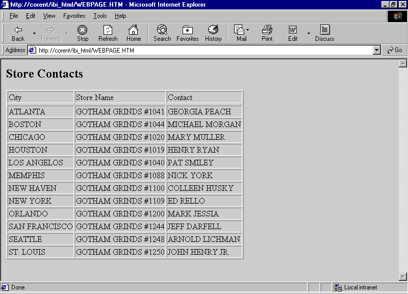 <HTML> <BODY BGCOLOR="#CCCCCC"> a. <H2>Store Contacts</H2> b. <!--WEBFOCUS TABLE AREPORT--> </BODY> </HTML>