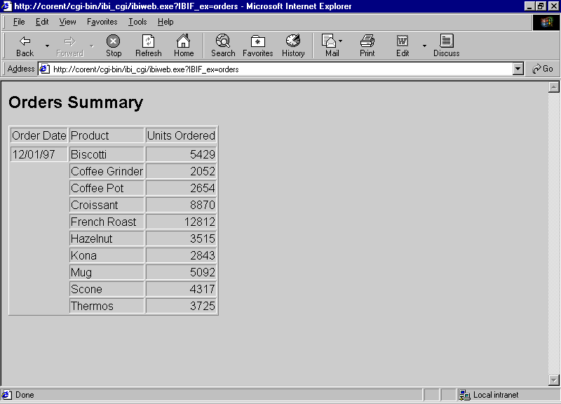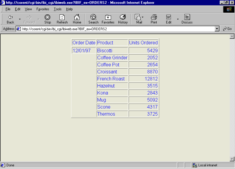 SET PAGE-NUM = OFF TABLE FILE GGORDER SUM QUANTITY AS 'Units Ordered' BY HIGHEST 1 ORDER_DATE AS 'Order Date' BY PRODUCT_DESCRIPTION a. ON TABLE HOLD FORMAT HTMTABLE AS ORDERS2 END b. -HTMLFORM BEGIN <HTML><HEAD><STYLE>TD {FONT-FAMILY: ARIAL; COLOR: BLUE;}</STYLE></HEAD> <BODY BGCOLOR="FAEBD7"><DIV align="left"> c. !IBI.FIL.ORDERS2; </DIV></BODY></HTML> b. -HTMLFORM END