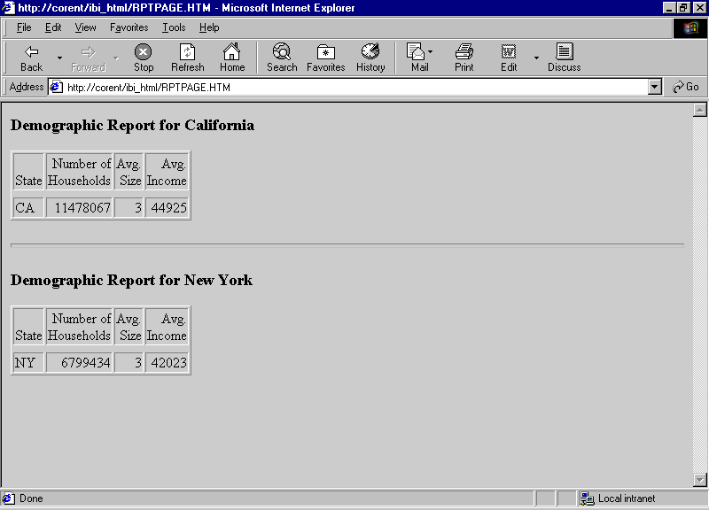<HTML> <BODY BGCOLOR="#CCCCCC"> a. <H3>Demographic Report for California</H3> b. <!--WEBFOCUS TABLE UPPER--> <HR SIZE=5> a. <H3>Demographic Report for New York</H3> b. <!--WEBFOCUS TABLE LOWER--> </BODY> </HTML>