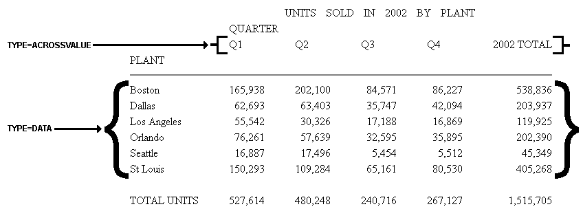 The following illustrates where the DATA and ACROSSVALUE components appear in a report, and which TYPE values you use to identify them.