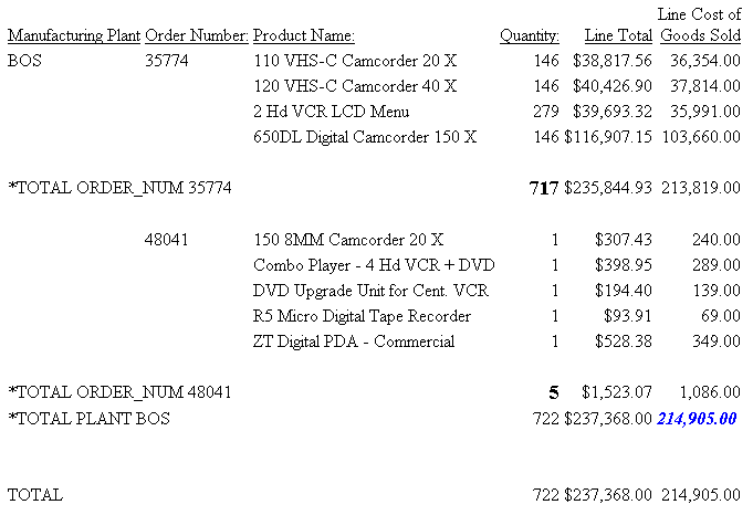 TABLE FILE CENTORD SUM QUANTITY LINEPRICE LINE_COGS AS 'Line Cost of, Goods Sold' BY PLANT BY ORDER_NUM ON PLANT RECAP QTY/F6=QUANTITY; WHERE PLANT EQ 'BOS' WHERE ORDER_NUM LT '56098' ON TABLE SET PAGE-NUM OFF ON TABLE SET STYLE * TYPE=REPORT, GRID=OFF, $ TYPE=RECAP, STYLE=BOLD+ITALIC, $ ENDSTYLE END