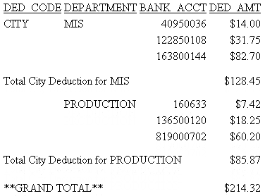 TABLE FILE EMPLOYEE SUM DED_AMT BY DED_CODE BY DEPARTMENT BY BANK_ACCT WHERE DED_CODE EQ 'CITY' WHERE BANK_ACCT NE 0 ON DEPARTMENT SUBTOTAL AS 'Total City Deduction for' ON TABLE COLUMN-TOTAL AS '**GRAND TOTAL**' ON TABLE SET PAGE-NUM OFF ON TABLE SET ONLINE-FMT HTML ON TABLE SET STYLESHEET * TYPE=REPORT, GRID=OFF, $ ENDSTYLE END