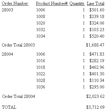 TABLE FILE CENTORD PRINT PNUM QUANTITY LINEPRICE BY ORDER_NUM SUBTOTAL LINEPRICE AS 'Order Total' WHERE ORDER_NUM EQ '28003' OR '28004'; ON TABLE SET PAGE-NUM OFF ON TABLE SET ONLINE-FMT HTML ON TABLE SET STYLESHEET * TYPE=REPORT, GRID=OFF, $ ENDSTYLE END