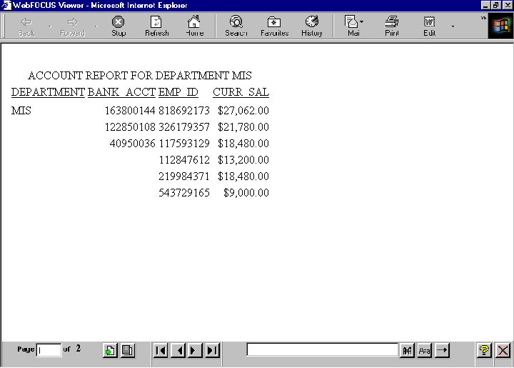 TABLE FILE EMPLOYEE HEADING CENTER "ACCOUNT REPORT FOR DEPARTMENT <DEPARTMENT" PRINT CURR_SAL BY DEPARTMENT BY HIGHEST BANK_ACCT BY EMP_ID ON DEPARTMENT PAGE-BREAK ON TABLE SET PAGE-NUM OFF ON TABLE SET WEBVIEWER ON ON TABLE SET ONLINE-FMT HTML ON TABLE SET STYLESHEET * TYPE=REPORT, SIZE=10, GRID=OFF,$ ENDSTYLE END