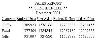 TABLE FILE GGSALES SUM BUDUNITS UNITS BUDDOLLARS DOLLARS BY CATEGORY ON TABLE SUBHEAD "SALES REPORT" "**(CONFIDENTIAL)**" "December 2001" ON TABLE SET PAGE-NUM OFF ON TABLE SET ONLINE-FMT HTML ON TABLE SET STYLESHEET * TYPE = REPORT, GRID=OFF, $ TYPE = TABHEADING, LINE = 1, JUSTIFY = CENTER, $ TYPE = TABHEADING, LINE = 2, JUSTIFY = CENTER, $ TYPE = TABHEADING, LINE = 3, JUSTIFY = RIGHT, $ ENDSTYLE END