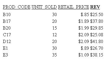 TABLE FILE SALES SUM UNIT_SOLD RETAIL_PRICE COMPUTE REV/D12.2M = UNIT_SOLD * RETAIL_PRICE; BY PROD_CODE WHERE CITY EQ 'NEW YORK' ON TABLE SET PAGE-NUM OFF ON TABLE SET ONLINE-FMT HTML ON TABLE SET STYLESHEET * TYPE=REPORT, GRID=OFF, $ TYPE=TITLE, COLUMN=REV, STYLE=BOLD, JUSTIFY=LEFT, $ ENDSTYLE END