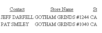 This request centers the column titles for STORE_NAME and ADDRESS1. The default column title for STORE_NAME is Store Name, as specified in the Master File with the TITLE attribute. The default column title for ADDRESS1 is Contact, also specified in the Master File. The request right justifies the column title for STATE, which is specified in the AS phrase as St.