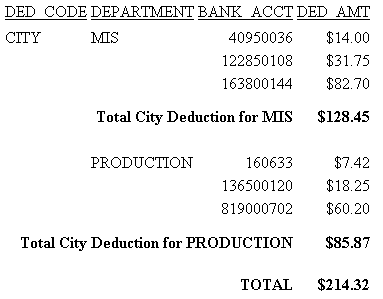 TABLE FILE EMPLOYEE SUM DED_AMT BY DED_CODE BY DEPARTMENT BY BANK_ACCT WHERE DED_CODE EQ 'CITY' WHERE BANK_ACCT NE 0 ON DEPARTMENT SUBTOTAL AS 'Total City Deduction for' ON TABLE SET PAGE-NUM OFF ON TABLE SET ONLINE-FMT HTML ON TABLE SET STYLESHEET * TYPE=REPORT, GRID=OFF, $ TYPE=SUBTOTAL, STYLE=BOLD, JUSTIFY=RIGHT,$ TYPE=GRANDTOTAL, STYLE=BOLD, JUSTIFY=RIGHT,$ ENDSTYLE END