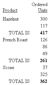 This request creates an HTML report using HEADALIGN = BODY to align the two elements of the sort footing (TOTAL IS and the value) with each of the two data columns (Product and Ordered Units). JUSTIFY = RIGHT, which applies to the entire sort footing, right justifies each sort footing element under the data column.