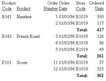 TABLE FILE GGORDER PRINT ORDER_NUMBER ORDER_DATE STORE_CODE QUANTITY BY PRODUCT_CODE BY PRODUCT_DESCRIPTION WHERE ORDER_DATE EQ '01/01/96' WHERE STORE_CODE EQ 'R1019' ON PRODUCT_CODE SUBFOOT "Total: <ST.QUANTITY" ON TABLE SET PAGE-NUM OFF ON TABLE SET ONLINE-FMT HTML ON TABLE SET STYLESHEET * TYPE = REPORT, GRID = OFF, $ TYPE = SUBFOOT, HEADALIGN = BODY, JUSTIFY = RIGHT, STYLE = BOLD, $ TYPE = SUBFOOT, OBJECT = TEXT, COLSPAN = 5, $ ENDSTYLE END