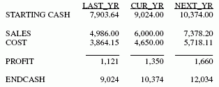 DEFINE FILE REGION CUR_YR=E_ACTUAL; LAST_YR=.831*CUR_YR; NEXT_YR=1.2297*CUR_YR; END TABLE FILE REGION SUM LAST_YR CUR_YR NEXT_YR FOR ACCOUNT 10$$ AS 'STARTING CASH' LABEL STCASH OVER RECAP STCASH(2,*) = ENDCASH(*-1); OVER " " OVER 3000 AS 'SALES' LABEL SLS OVER 3100 AS 'COST' LABEL COST OVER BAR OVER RECAP PROFIT/I5C = SLS - COST; OVER " " OVER RECAP ENDCASH/I5C = STCASH + PROFIT; END