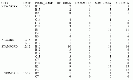 TABLE FILE SALES PRINT RETURNS AND DAMAGED SOMEDATA ALLDATA BY CITY BY DATE BY PROD_CODE END