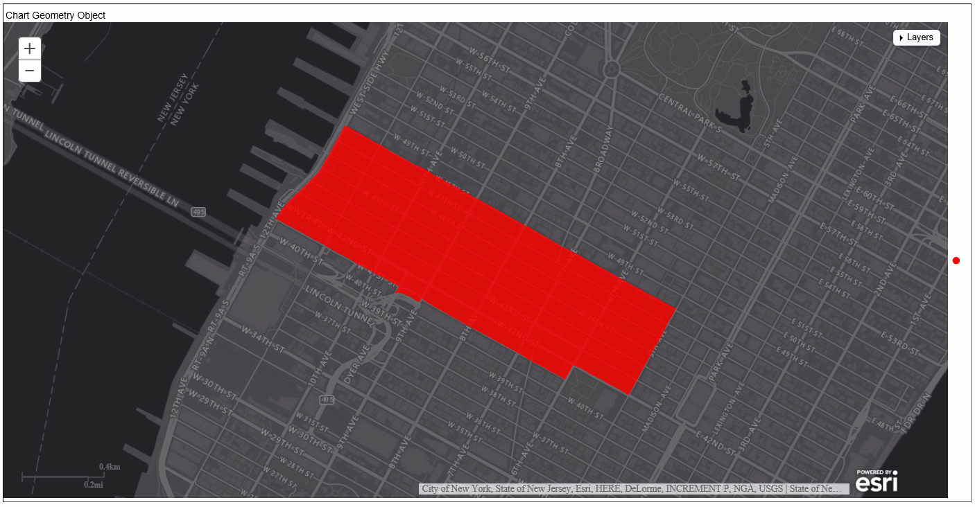 The following request uses GIS_GEOMETRY to build a geometry object and chart it on an Esri map.