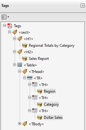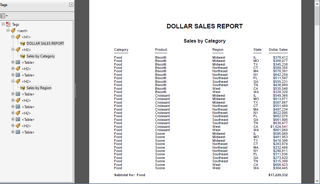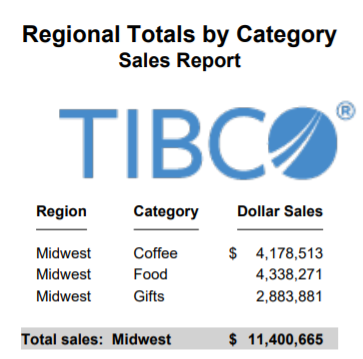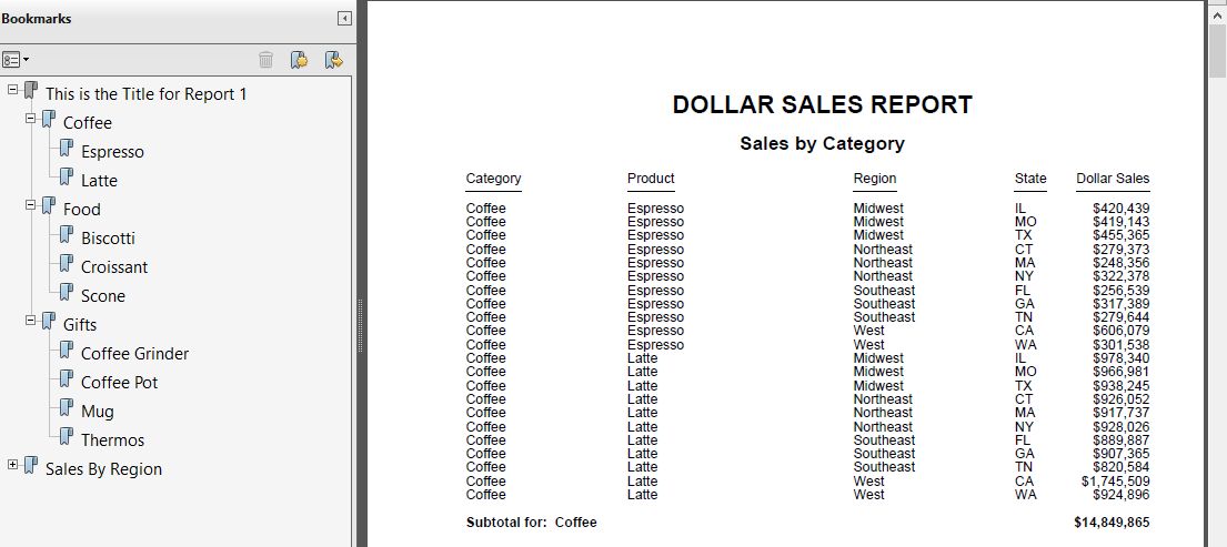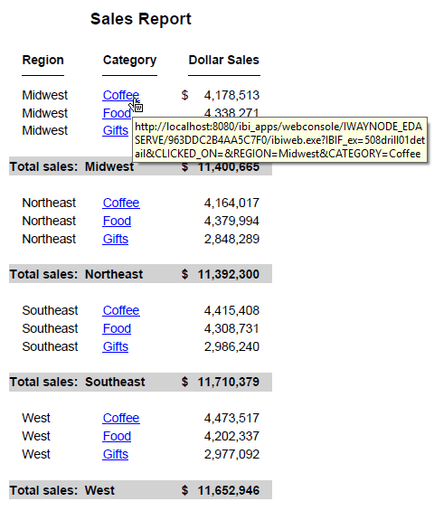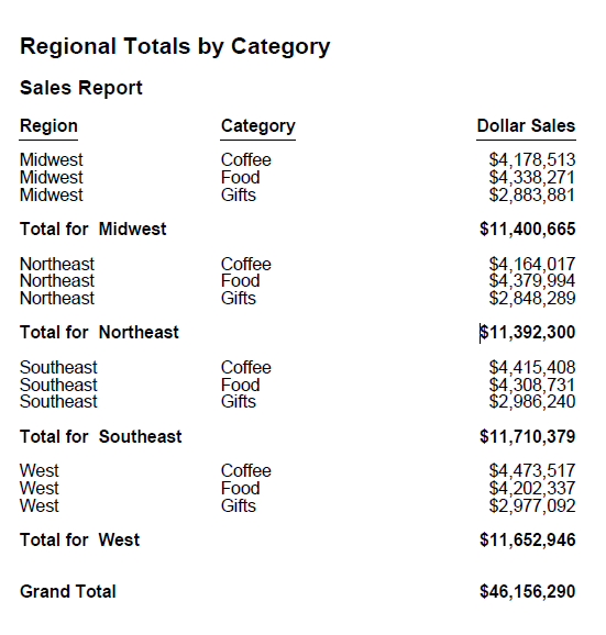 TABLE FILE GGSALES SUM DOLLARS/D12M BY REGION BY CATEGORY ON REGION SUBTOTAL AS 'Total for ' HEADING " " "Sales Report" " " ON TABLE SET ACCESSPDF 508 ON TABLE SET PAGE-NUM OFF ON TABLE COLUMN-TOTAL AS 'Grand Total' ON TABLE SUBHEAD "Regional Totals by Category" ON TABLE PCHOLD FORMAT PDF ON TABLE SET STYLE * TYPE=REPORT, FONT='ARIAL',$ TYPE=TITLE, COLUMN=N1, FONT='ARIAL', STYLE=BOLD,$ TYPE=TITLE, COLUMN=N2, FONT='ARIAL', STYLE=BOLD,$ TYPE=TITLE, COLUMN=N3, FONT='ARIAL', STYLE=BOLD,$ TYPE=HEADING, SIZE=14, STYLE=BOLD,$ TYPE=TABHEADING, SIZE=16, STYLE=BOLD,$ TYPE=SUBTOTAL, BY=1, STYLE=BOLD,$ TYPE=GRANDTOTAL, FONT='ARIAL', STYLE=BOLD,$ ENDSTYLE END