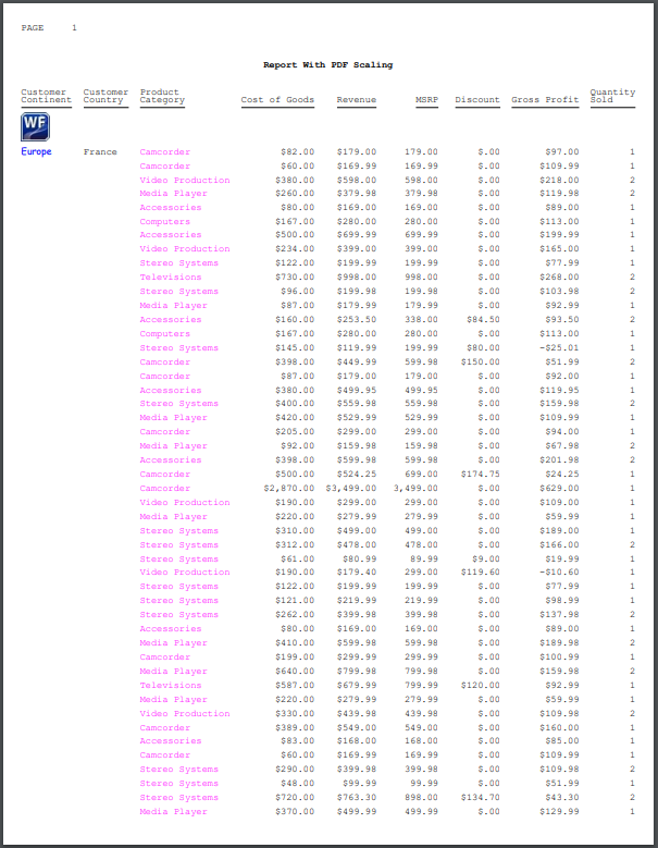 SET SQUEEZE=ON DEFINE FILE WF_RETAIL_LITE SHOWPIC/A100='C:\ibi\WebFOCUS82\samples\web_resource\signin\images\favicon.jpg'; END TABLE FILE WF_RETAIL_LITE PRINT PRODUCT_CATEGORY COGS_US REVENUE_US MSRP_US DISCOUNT_US GROSS_PROFIT_US QUANTITY_SOLD BY SHOWPIC NOPRINT BY CONTINENT_NAME BY COUNTRY_NAME WHERE COUNTRY_NAME EQ 'FRANCE' OR 'ITALY' WHERE RECORDLIMIT=3000; ON TABLE SUBHEAD " " " " " Report With PDF Scaling " " " " " ON COUNTRY_NAME SUBHEAD " " " " ON TABLE PCHOLD FORMAT PDF ON TABLE SET STYLE * TYPE=REPORT, PAGE-SCALE=AUTO, $ TYPE=DATA, COLUMN=CONTINENT_NAME, FONT=COMIC SANS MS, COLOR=BLUE, STYLE=BOLD+ITALIC, $ TYPE=DATA, COLUMN=PRODUCT_CATEGORY, COLOR=FUSCHIA, $ TYPE=HEADING, STYLE=BOLD, COLOR=RGB(0 35 95), SIZE=12, JUSTIFY=CENTER, $ TYPE=SUBHEAD, SIZE=18, STYLE=BOLD, COLOR=RED, $ TYPE=SUBHEAD, IMAGE=(SHOWPIC), SIZE=(.5 .5), $ TYPE=TABHEADING, SIZE=12, STYLE=BOLD, JUSTIFY=CENTER, $ ENDSTYLE END
