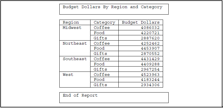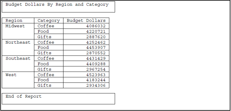 TABLE FILE GGSALES SUM BUDDOLLARS BY REGION BY CATEGORY HEADING "Budget Dollars By Region and Product Category " " " FOOTING "End of Report " " " ON TABLE SET PAGE-NUM NOLEAD ON TABLE PCHOLD FORMAT PDF ON TABLE SET STYLE * SQUEEZE=ON, GRID=ON, $ TYPE=REPORT, JUSTIFYREPORT=LEFT,$ ENDSTYLE END