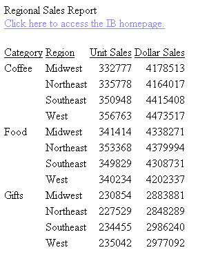 TABLE FILE GGSALES ON TABLE SET PAGE-NUM OFF SUM UNITS AND DOLLARS BY CATEGORY BY REGION HEADING "Regional Sales Report" "Click here to access the IB homepage." " " ON TABLE SET STYLE * TYPE=REPORT, GRID=OFF, $ TYPE=HEADING, LINE=2, OBJECT=TEXT, ITEM=1, URL=http://www.ibi.com, $ ENDSTYLE END