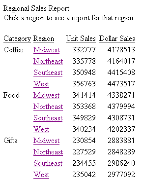 TABLE FILE GGSALES ON TABLE SET PAGE-NUM OFF SUM UNITS AND DOLLARS BY CATEGORY BY REGION HEADING "Regional Sales Report" " " ON TABLE SET STYLE * TYPE=REPORT, GRID=OFF, $ TYPE=DATA, COLUMN=REGION, URL=/ibi_apps/WFServlet?(IBIF_ex='ggdrill' AREA=REGION IBIC_server='EDASERVE' IBI_APPS='IBISAMP'),$ ENDSTYLE END