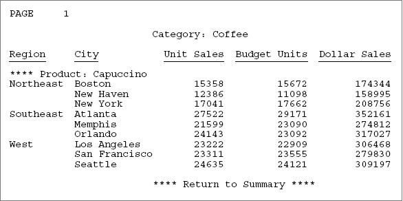 SET SQUEEZE=ON TABLE FILE GGSALES SUM UNITS BUDUNITS DOLLARS BY CATEGORY NOPRINT BY PRODUCT NOPRINT ON CATEGORY PAGE-BREAK HEADING CENTER "Category: <CATEGORY" " " ON PRODUCT SUBHEAD "**** Product: <PRODUCT" ON PRODUCT SUBFOOT " " "<25 **** Return to Summary ****" ON PRODUCT PAGE-BREAK BY REGION BY CITY ON TABLE PCHOLD FORMAT PDF END
