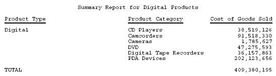 SET ONLINE-FMT=PDF TABLE FILE CENTORD HEADING CENTER "Summary Report for Digital Products" " " SUM LINE_COGS/D12 AS 'Cost of Goods Sold' BY PRODTYPE AS 'Product Type' BY PRODCAT AS 'Product Category' WHERE PRODTYPE EQ 'Digital'; ON TABLE COLUMN-TOTAL/D12 ON TABLE SET PAGE-NUM OFF ON TABLE SET STYLE * TYPE=REPORT, COLUMN=PRODCAT, LEFTGAP=1.5, $ ENDSTYLE END
