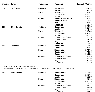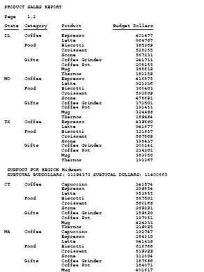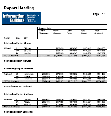 The following request against the GGSALES data source has a report heading, a page heading with an image, a footing, a subheading, a subfooting, and a subtotal.