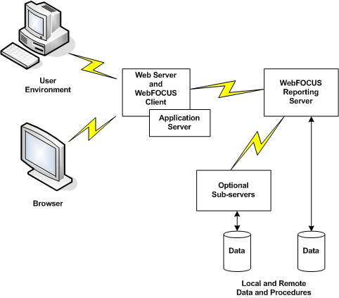 Optional WebFOCUS sub-servers access data on remote platforms sources.