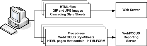Presentation logic resides on the web server, and user interface logic resides on the WebFOCUS Reporting Server.