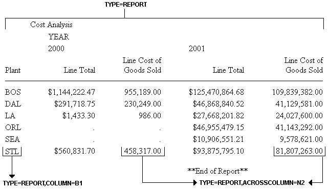 The following illustrates where the REPORT component and the COLUMN and ACROSSCOLUMN attributes appear in a report, and which TYPE values you use to identify them. Although in this example the value for COLUMN is B1 and the value for ACROSSCOLUMN is N2, these are not the only values you can use to identify these components.