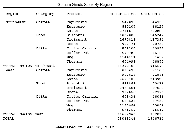TABLE FILE GGSALES HEADING CENTER "Gotham Grinds Sales By Region" FOOTING CENTER "Generated on: &DATETMDYY" SUM DOLLARS UNITS BY REGION SUBTOTAL BY CATEGORY BY PRODUCT WHERE REGION EQ 'Northeast' OR 'West' ON TABLE PCHOLD FORMAT PDF ON TABLE SET DROPBLNKLINE OFF ON TABLE SET PAGE NOPAGE ON TABLE SET STYLE * SQUEEZE = ON, FONT = ARIAL, TYPE=HEADING, BORDER=LIGHT, $ ENDSTYLE END