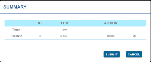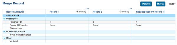 Manually select multiple records to merge into one record. The primary selected record is treated as the target record. All the remaining selected records are treated as the source records. You can select the attribute values and relationships from source records and merge them into the target record.