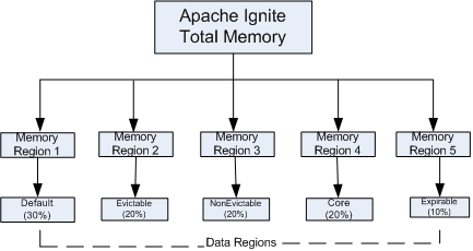 A data region is a logical expandable area. Durable memory includes one or more data regions that can vary in size and eviction policies, be persisted on disk. By default, the Apache Ignite node creates the Default region that allocates 30% memory of total memory. The TIBCO MDM Ignite node creates the following custom types of region: