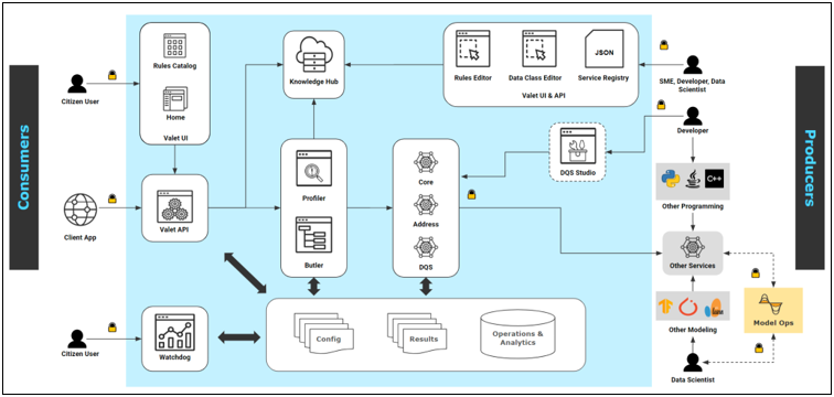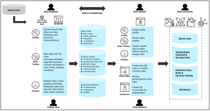 Consumers are users who play the role of citizen user, data engineer, data analyst, data scientist, data steward, etc. These users will interact with the application to discover data attributes and other technical characteristics, discover attribute relationships, detect outliers and anomalies, embed data quality analysis in data pipelines and data integration jobs, evaluate and review data quality scores and monitor and govern their data assets on different data quality dimensions.