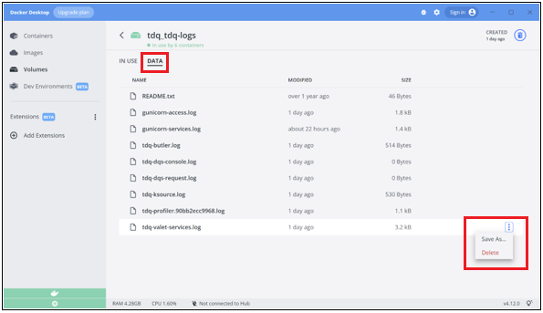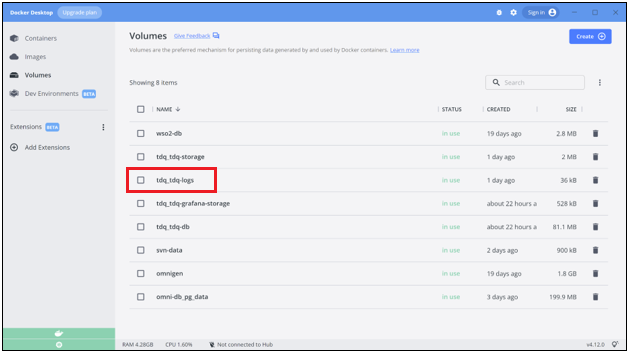 If you are using the WSL2 engine with Docker Desktop, then the tdq-logs volume can be accessed through the WSL2 file system at: