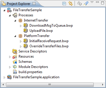 The sample project contains two process folders: InternetTransfer and PlatformTransfer. Each folder contains two processes.