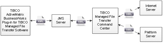 The plug-in communicates with TIBCO Managed File Transfer Command Center through the JMS server, as shown in the following figure:
