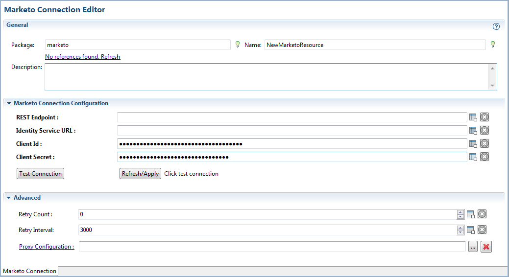 The resource folder, package name, and resource name of the Marketo connection are provided by default. If you do not want to use the default configurations, change them accordingly. Click