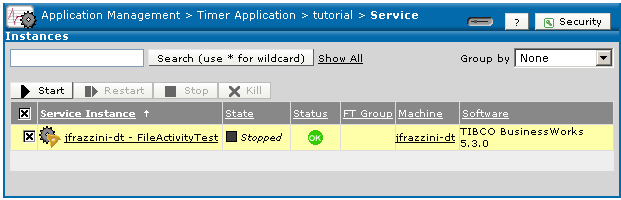Start the Application This section gives an overview of starting an application. If you deployed using Deploy on Save, the tutorial application is actually started by default. To start service instances, follow these steps: 1. In TIBCO Administrator, select the application in the left panel, and then click Service Instances. 2. In the Service Instances console, click the check box next to the Service Instance (named after the machine and the process archive) and click Start. The State column changes to first show Starting Up, and then Running.