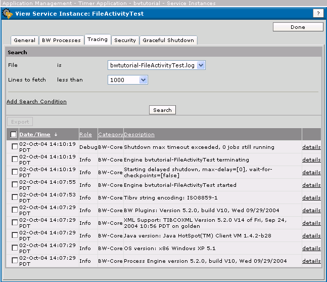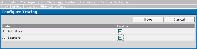 1. Choose Application Management> Timer Application > tutorial > Service Instances and select the <machine>-FileActivitiesTest service instance, and then the Tracing tab.