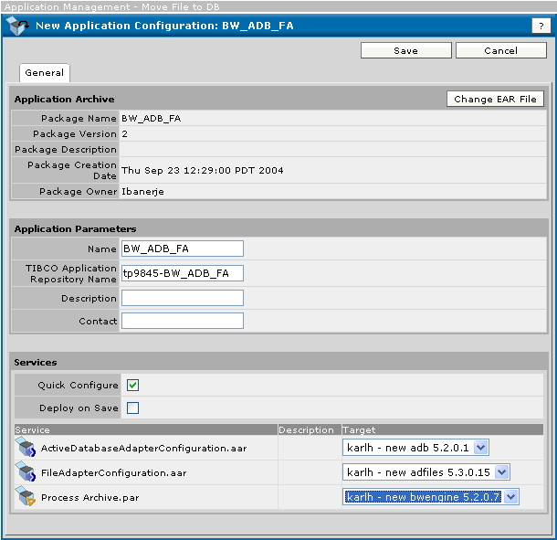 • If Quick Configure is selected, Deploy on Save can be selected. When the Save button is clicked, the application is created and immediately deployed to the target machines specified in the Services pane, Target column. All variables, logging and other configuration values will use defaults defined in the archive file. The next screen will display the deployment status.If Deploy on Save is not selected, the application must be explicitly deployed using the application’s Configuration Console that displays upon save. This allows you to change settings, such as global variable settings and runtime options before deploying.