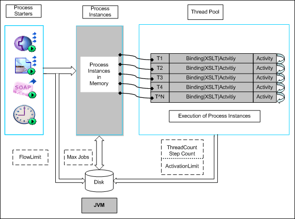 Figure 6, Process Execution in BusinessWorks Engine, illustrates the way process instances are processed in BusinessWorks and the various factors that affect the performance of the engine.