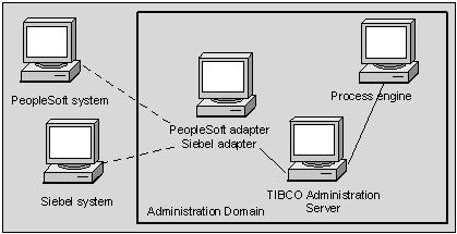 When you install a TIBCO ActiveMatrix 1BusinessWorks component, you must specify the administration domain to which a machine belongs. Before installing the software, you should therefore determine what resources should belong to a administration domain. Ask yourself these questions:Figure 14 Domain setup for example program