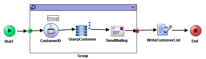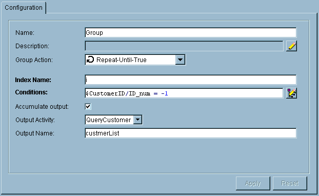 For each iteration of the loop, the output of the QueryCustomer activity is placed into a variable named customerList.The condition evaluates the value of CustomerID/ID_num. The Customer ID activity outputs -1 when there are no more customers, so the condition examines the value and when it is -1, the loop can exit.