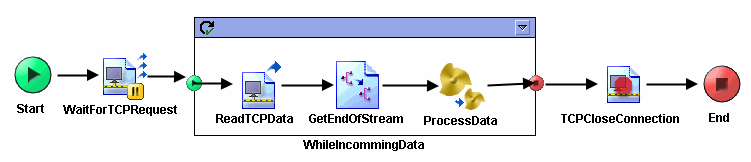 While True Loop The While True loop repeats the series of grouped activities as long as the given condition evaluates as true. The condition is evaluated when the group is entered. If the condition evaluates to false, the activities within the group are not executed. The following is an example of a While True loop. The process performs the following operations: 1. A Wait for TCP Request activity waits for an incoming TCP request. 2. When a request is received, a transition is taken to a While True loop. The output of the GetEndOfStream activity within the group is accumulated in a variable named endOfStream. This allows the condition of the group to be set as follows: not($endOfStream/AccumulatedOutput/EndOfStreamMarker/ EndOfStreamReached) So, the condition evaluates to true because EndOfStreamReached is false the first time the loop is executed. 3. Within the group, a Read TCP Data activity reads from the TCP input stream until a separator is reached. 4. The GetEndOfStream activity retrieves the value of $ReadTCPData/ActivityOutput/endOfStreamReached. This output item of the Read TCP Data activity is set to true when the end of the output stream is reached. So, the GetEndOfStream activity will have an output value of false, until the Read TCP Data activity detects the end of the output stream. 5. The Process Data process is called to handle the incoming data from the TCP stream. 6. The loop repeats until the Read TCP Data activity detects the end of the input stream. When this is detected, the loop condition evaluates to false, and the loop exits.