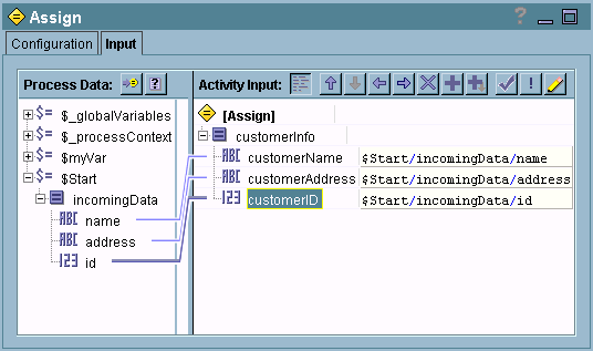 Activities can use output from previously executed activities by mapping data from the process variable to the activity’s input. See Input for more information about the Input tab and mapping process data to an activity’s input.There are two process variables that are available to all activities that accept input: $_globalVariables and $_processContext. $_globalVariables contains the list of global variables defined on the Global Variables tab of the project. See Global Variables for more information about global variables. $_processContext contains general information about the process, such as the process ID, the project name, whether the process was restarted from a checkpoint, and so on.