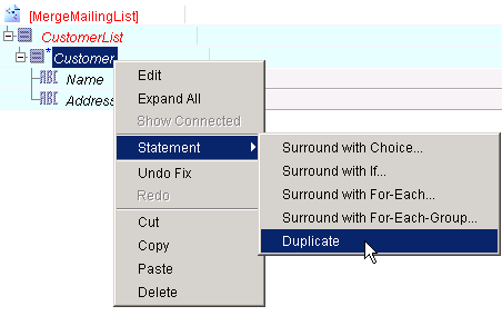 1. Select the repeating element in the Activity Input area, right-click, and select Statement > Duplicate from the popup menu.