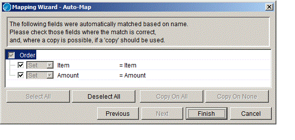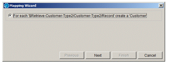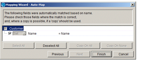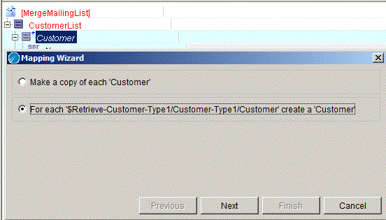2. Map one of the elements from the Process Data to the first copy of the repeating element in the activity input. For example, map $Retrieve-Customer-Type1/Customer to MergeMailingList/CustomerList/Customer.The mapping wizard asks if you wish to automatically map items with the same names. Click Finish to accept the default mappings.